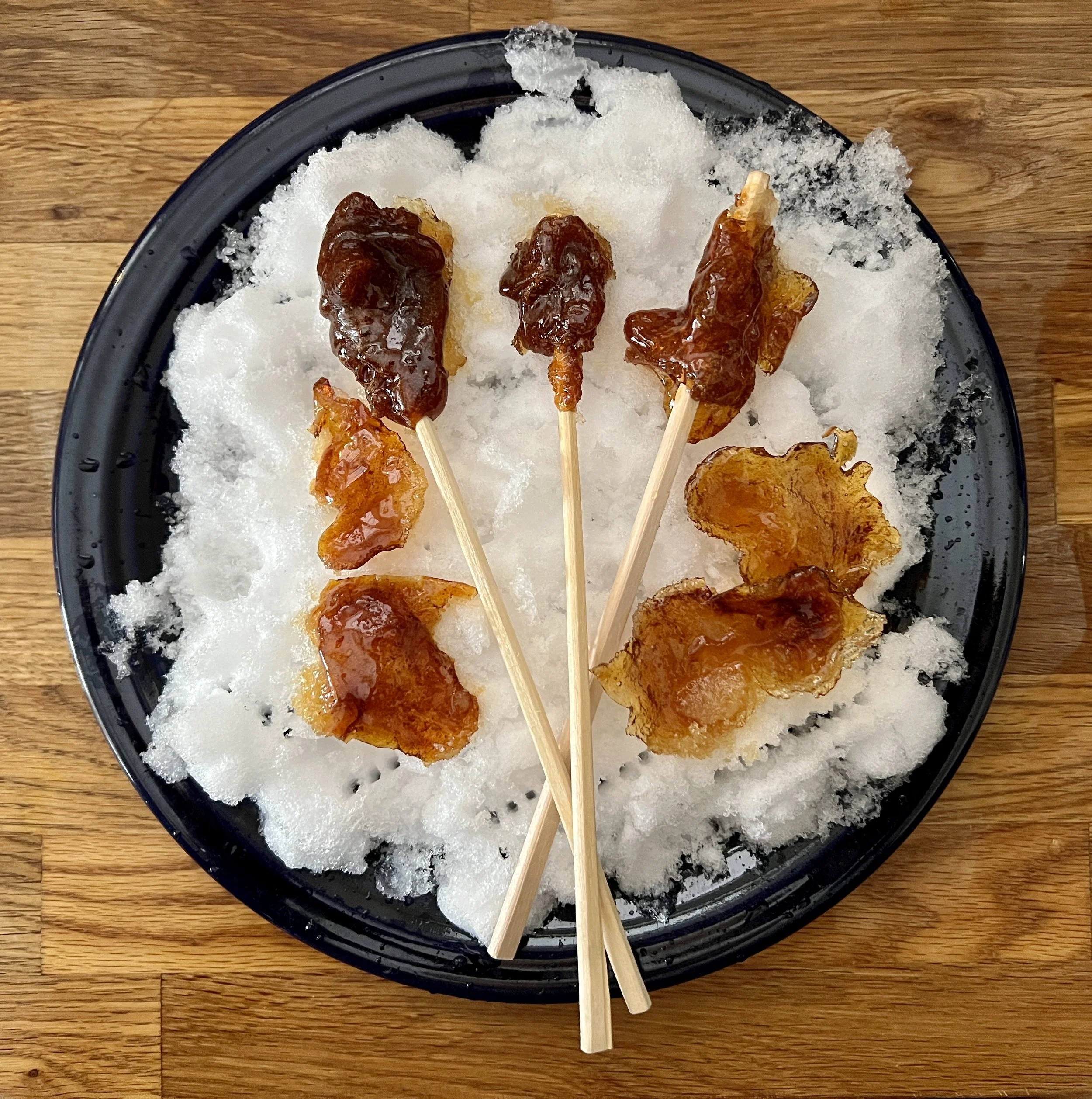 Drizzle the hot syrup over the packed snow. Straight lines of it will do well to be twirled up but feel free to get creative and make swirls and the like.