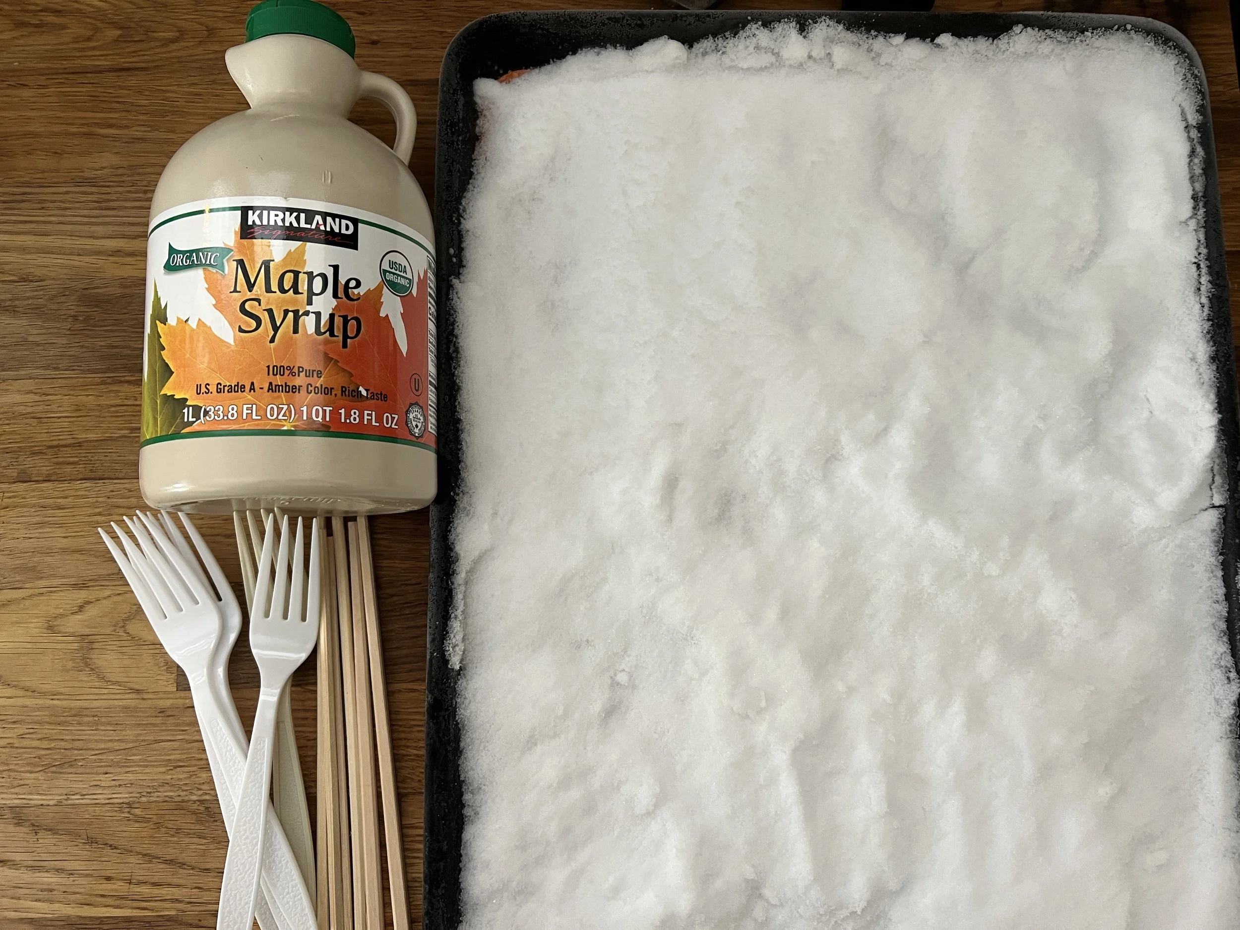 Sugar on Snow is maple syrup brought up to a boiling 235° and then drizzled over packed snow, where it seizes up into a chewy, caramel-like candy. You can roll it up onto a popsicle stick or just pick it up with your fingers and eat as is. This is a delicious treat that is fun to make with the kiddos - they are always delighted to watch the syrup harden to candy right before their eyes!