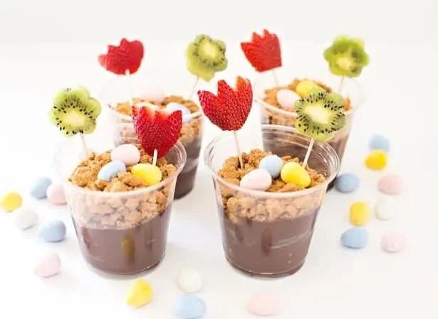 Kids will love this snack that looks like a mini garden they can eat! It's simple to make, visually appealing, and you can easily substitute ingredients based on what you have available. You can even use prepackaged pudding or yogurt cups.
